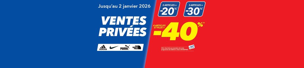 (1) Offre valable du 15 décembre 2025 au 2 janvier 2026 sur présentation de votre carte INTERSPORT, dans les magasins participants. Il vous sera consenti une remise de -20% dès 2 articles, -30% dès 3 articles, -40% dès 4 articles ou plus, sur les articles signalés en magasin, hors nouvelle collection et hors promotions en cours. Offre non cumulable et dans la limite des stocks disponibles. Liste des magasins participants sur www.intersport.be. Voir conditions en magasin. Ne pas jeter sur la voie publique. Sous réserve d’erreurs ou d’omissions.