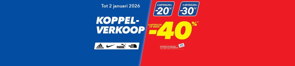 (1) Aanbieding geldig van 15 december 2025 tot 2 januari 2026 op vertoon van je INTERSPORT-kaart, in de deelnemende winkels. Ontvang een korting van -20% vanaf 2 artikelen, -30% vanaf 3 artikelen en -40% vanaf 4 artikelen of meer, op artikelen aangeduid in de winkel, uitgezonderd nieuwe collectie en lopende promoties. Aanbieding niet cumuleerbaar en geldig zolang de voorraad strekt. Lijst deelnemende winkels op www.intersport.be. Zie voorwaarden in de winkel. Niet op de openbare weg gooien. Onder voorbehoud van fouten of weglatingen.